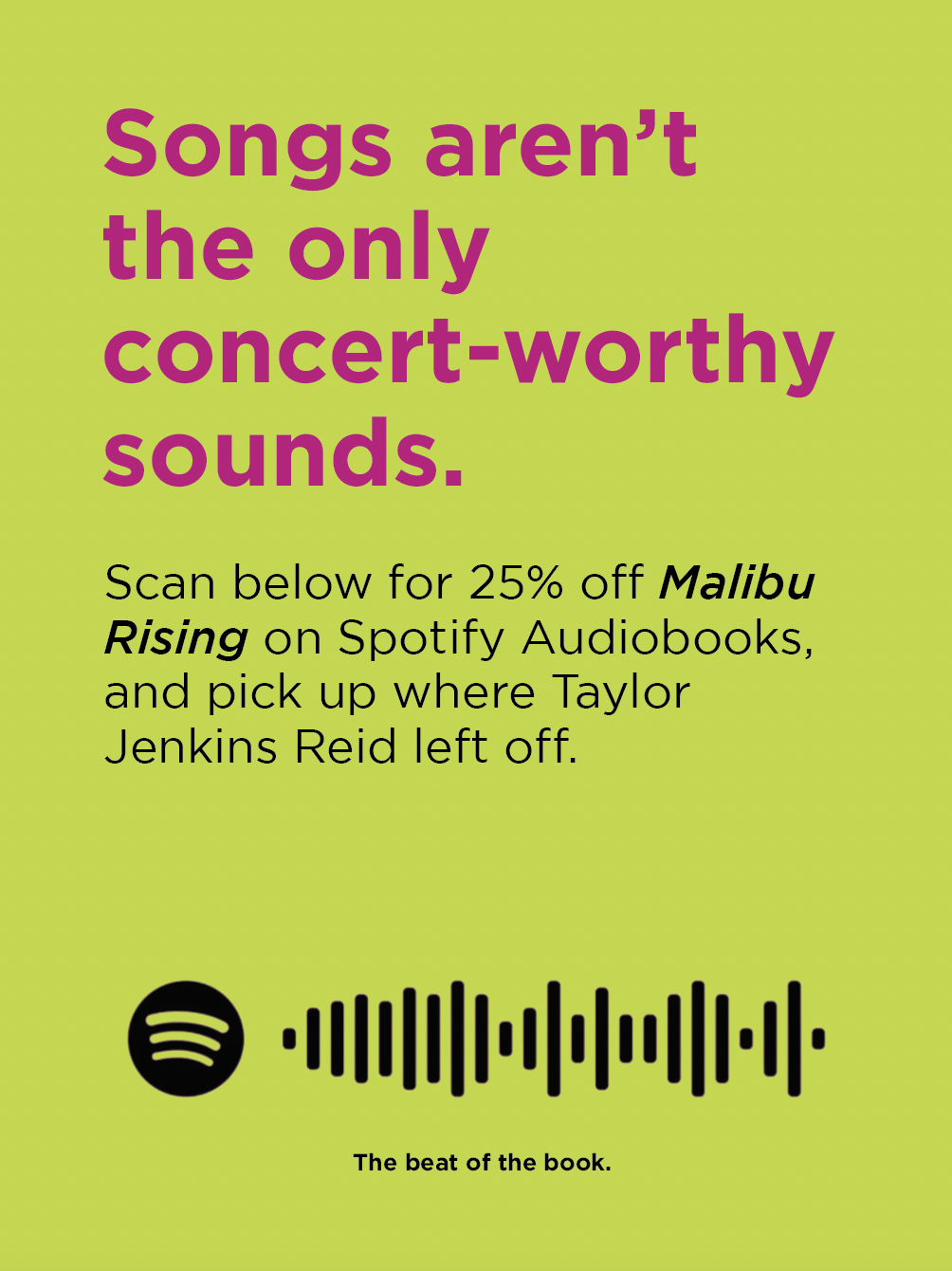 Touring artists’ favorite authors surprise the audience with a live reading of an opening chapter from one of their books before the first scheduled opener. The poster is displayed on the stage screens giving listeners the chance to purchase the Spotify Audiobook for reduced prices to finish the story at home.