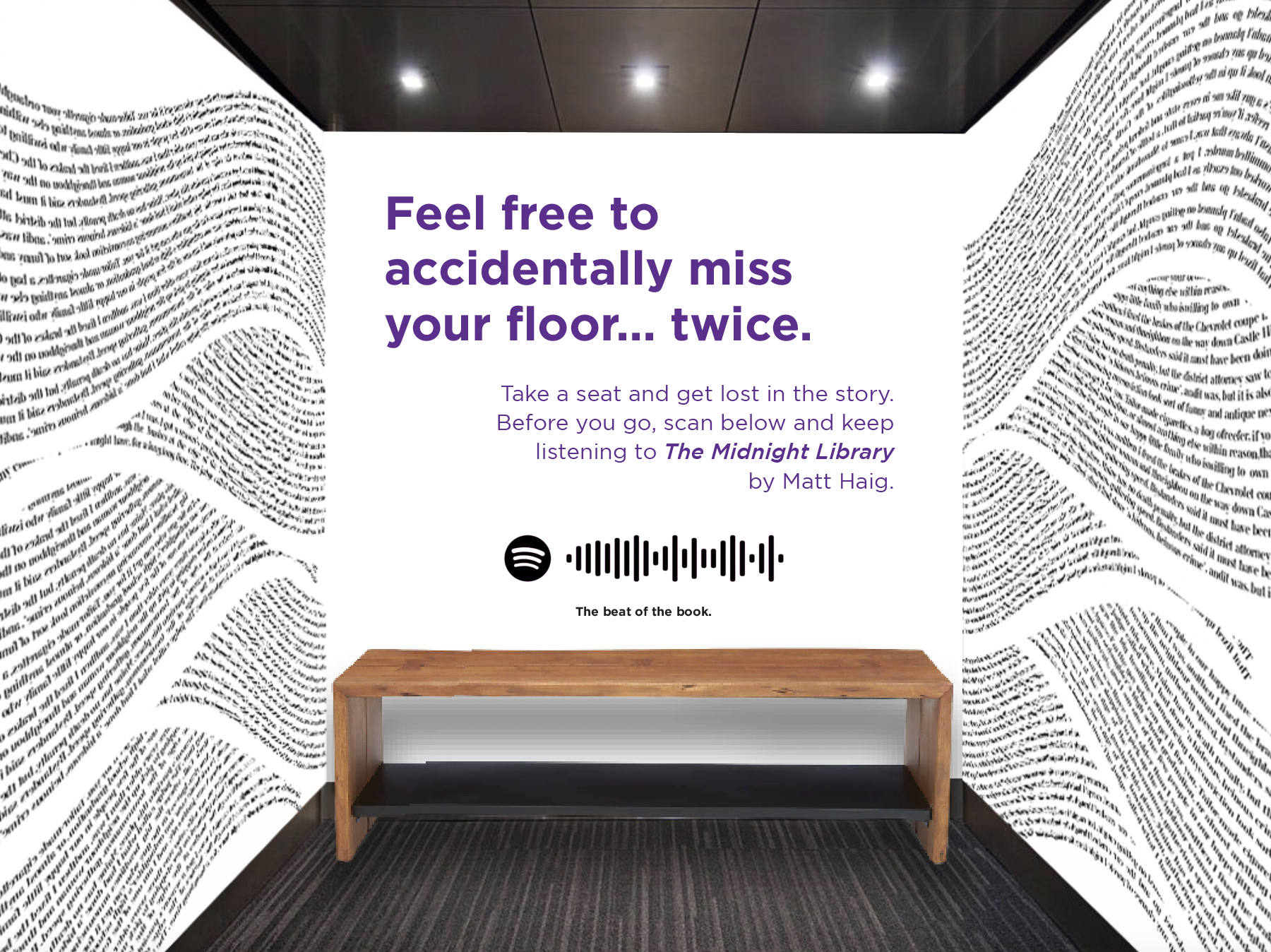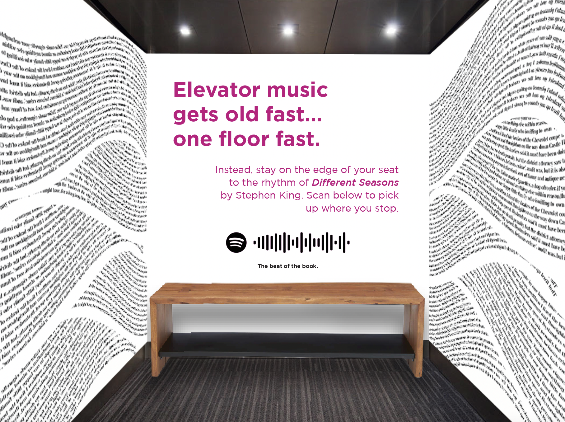 For one week, Spotify takes control of the aux of the elevators in the tallest and busiest buildings in metropolitan areas, replacing the boring and expected with engaging opening chapters of Spotify Audiobooks.